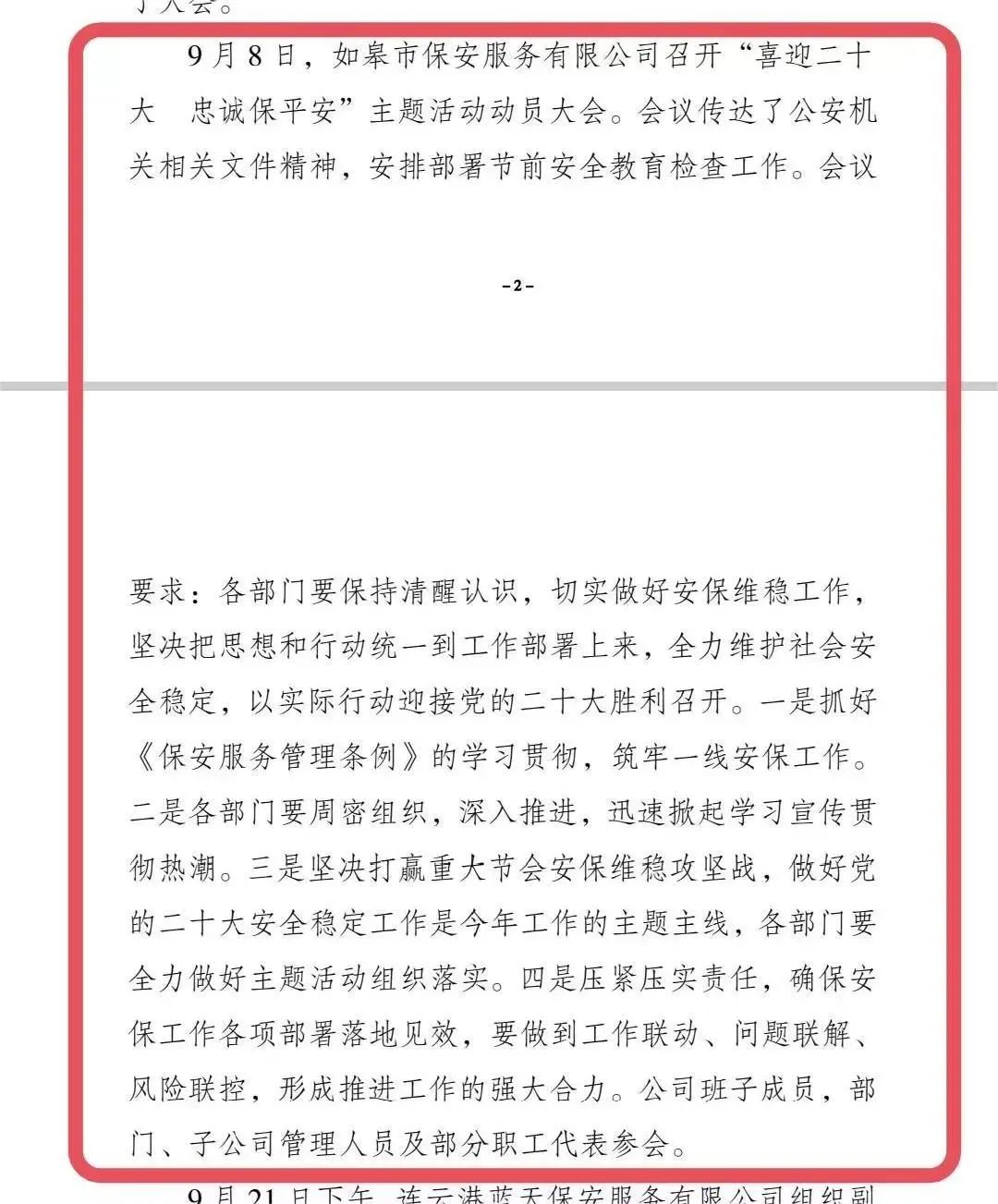 二十大召開前期,保安公司根據如皋市公安局黨委要求和富皋萬泰集團黨委工作部署,開展了“喜迎二十大,保安護平安”主題系列活動,作為如皋市日常社會管理的重要輔助力量,保安公司再次彰顯了社會責任擔當、科學規(guī)范管理、高效迅捷的執(zhí)行力,此次活動受到江蘇省保安協(xié)會的肯定。