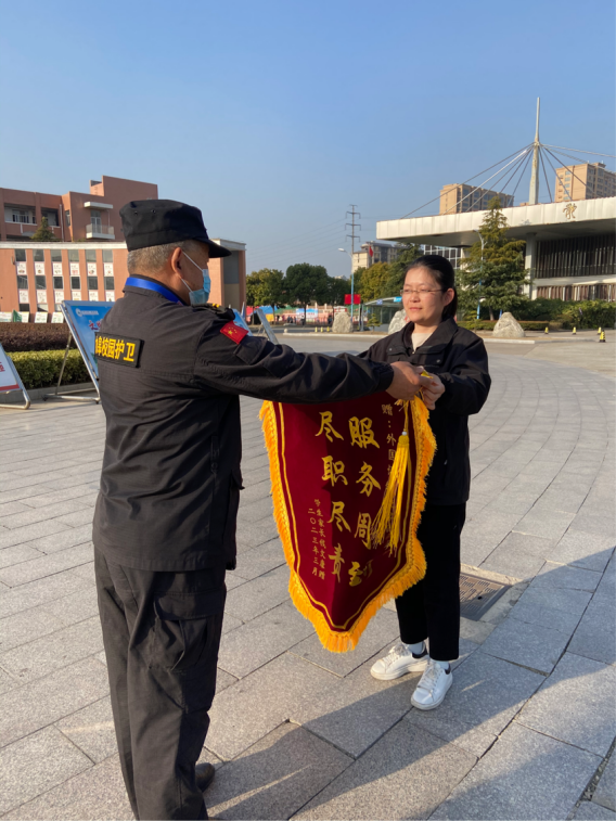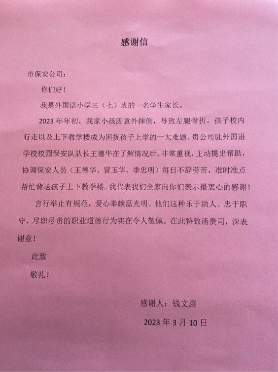前段時間,在外國語小學上下學期間都會出現溫馨一幕,有這么三名校園保安輪流每天背著一名腿部受傷的三年級男孩上下三樓的班級,不辭辛勞近2個月,這一善舉感動著師生和家長。近日,學生家長錢女士專程來到學校,送上一面寫有“服務周到,盡職盡責”字樣的錦旗,以示謝意!