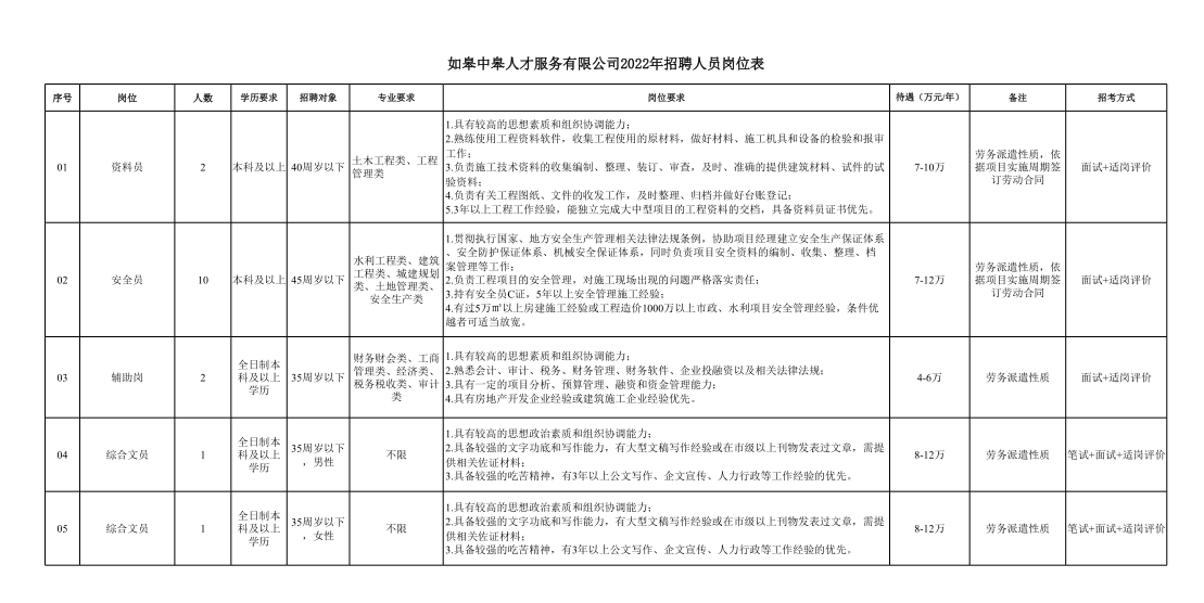 富皋萬泰集團下屬子公司如皋中皋人才服務有限公司招聘安全員10名,資料員2名,綜合文員2名,輔助崗(助理)2名,共16名。現發布招聘公告如下:
