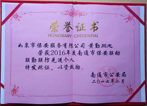 4月27日下午,南通市局召開全市保安“三聯”工作會議,表彰一批先進集體和個人。如皋市保安服務有限公司榮獲“南通市保安聯動聯勤聯防先進單位”光榮稱號,本公司保安員黃勤同志獲得“南通市保安聯動聯勤聯防先進個人”稱號。
