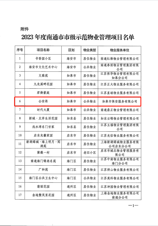 近日,南通市住房和城鄉建設局發布了《關于公布2023年度市級示范物業管理項目名單的通知》,如皋市保安公司承接的公安局項目憑借標準化物業服務脫穎而出,被評為“2023年度南通市市級示范物業管理項目”。